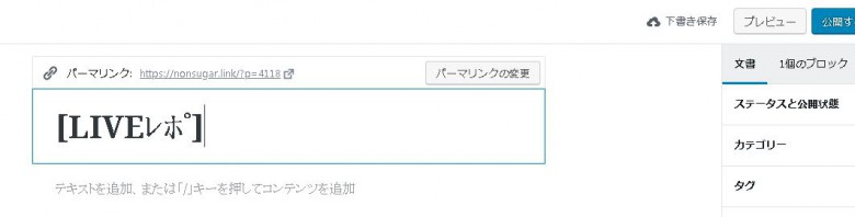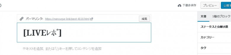 Gutenbergでは、記事タイトルのブロックをクリック(選択)すると現れます。ところがこの部分、新規作成直後の時点では編集ができません。